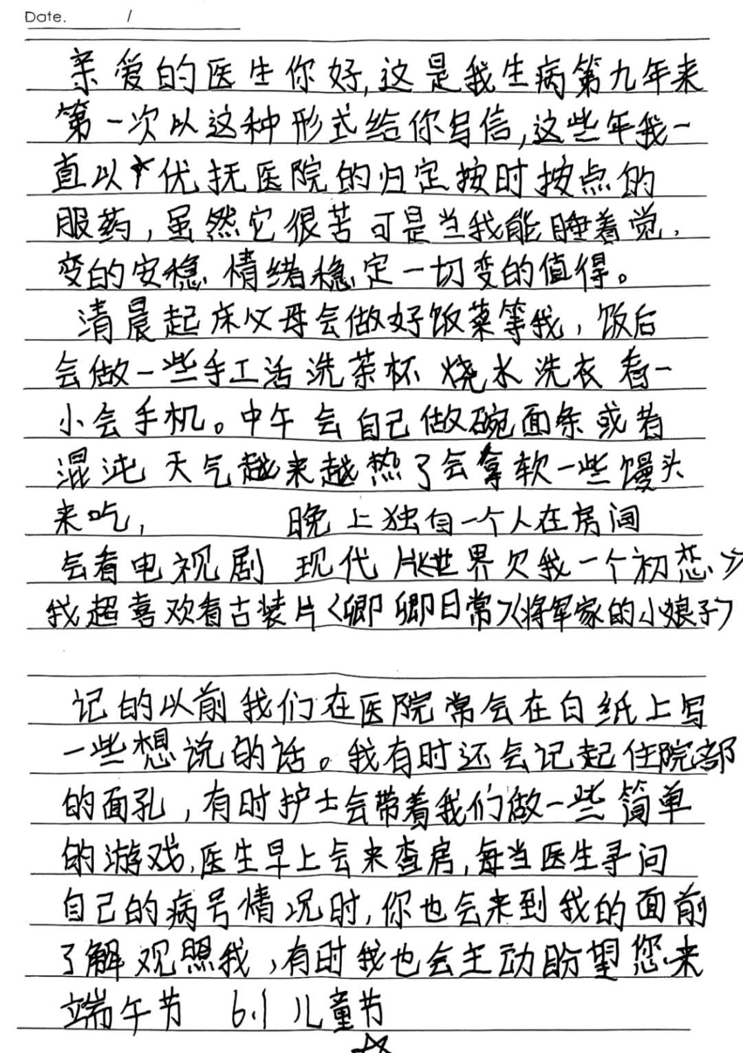 现在的小林已经能胜任家庭生活,为父母做饭,洗衣服,打扫卫生,具备独立的社会交往能力,还可以参加手工织网工作。最近小林再次来院复诊,为我带来了一封信,信上简单的描述了她生活中的点点滴滴,朴实无华的文字,体现了她对生活充满了希望。我也被小林的故事所感动,不禁潸然泪下。