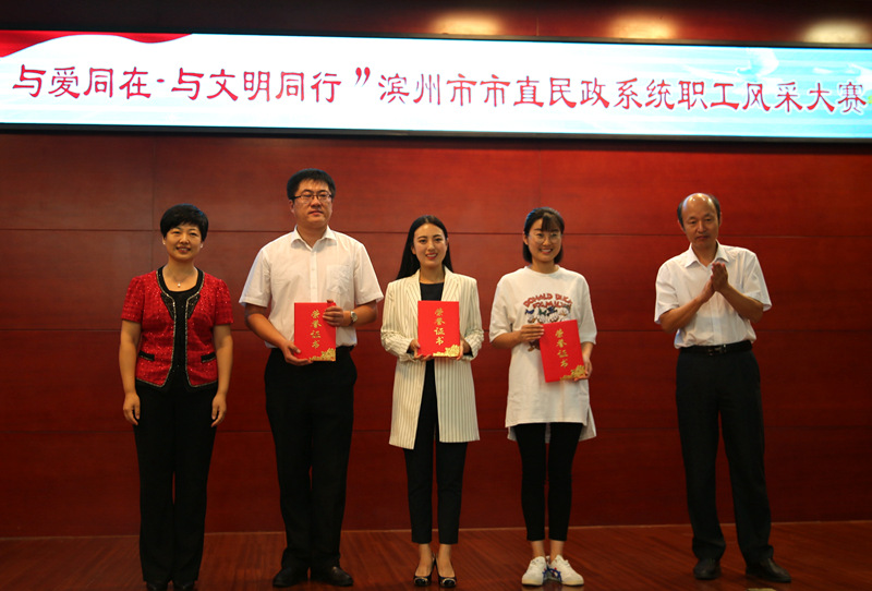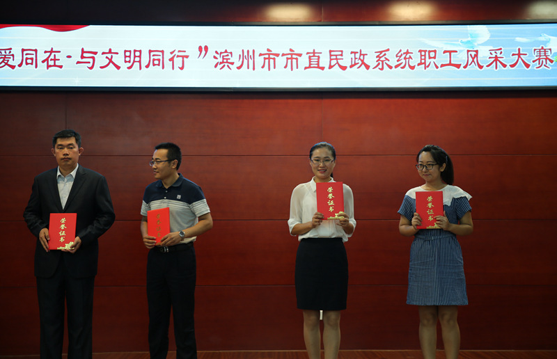 9月22日上午,由滨州市民政局举办的“福彩杯”滨州市市直民政系统“与爱同在·与文明同行”职工风采大赛于市民政局5楼会议室隆重举行,我院职工赵志刚、李艳杰等同志积极参加大赛并分别获得一等奖、三等奖的优异成绩。